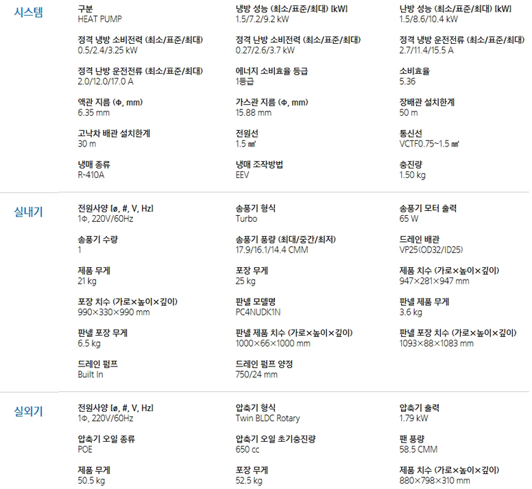 벽걸이형 5M / 스텐드형 8M / 천정형 및 58평이상 기본배관 없음